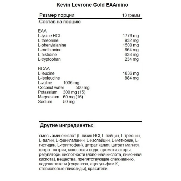 Состав: комплекс аминокислот (L-лейцин, L-лизин HCl, L-фенилаланин, L-валин, L-треонин, L-изолейцин, L-метионин, L-гистидин, L-триптофан), цитрат калия, ароматизаторы , кислоты (Е330, Е296) , кокосовая вода, кислоты (Е330, Е296) , ароматизаторы , цитрат магния, ароматизаторы , кислоты (Е330, Е296) , ароматизаторы , хлорид натрия, антислеживатель (Е551), подсластители (ацесульфам К, сукралоза, стевиолгликозиды), концентрат сока красной свеклы , краситель/ы (E160a , Е110 8 , Е104 , Е163 ). Е104, Е110.