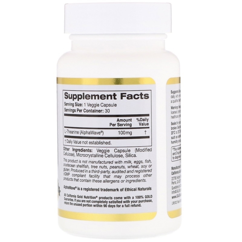 California Gold Nutrition содержит AlphaWave — запатентованную форму L-теанина высокой очистки, стандартизованного до 98%-го содержания L-теанина. Препарат производится в США и соответствует или превосходит все наши количественные и качественные стандарты качества.