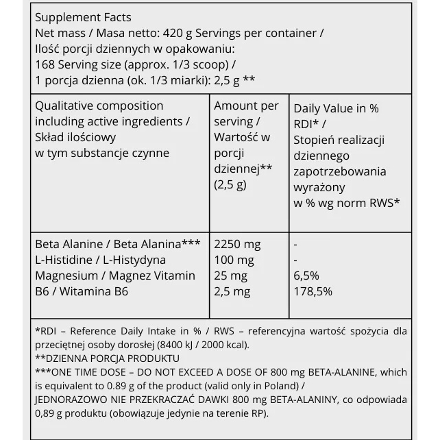 Применение: Рекомендуемая дозировка бета-аланина 1 порция, 2,5 г, 2 раза в день