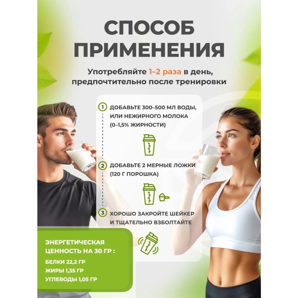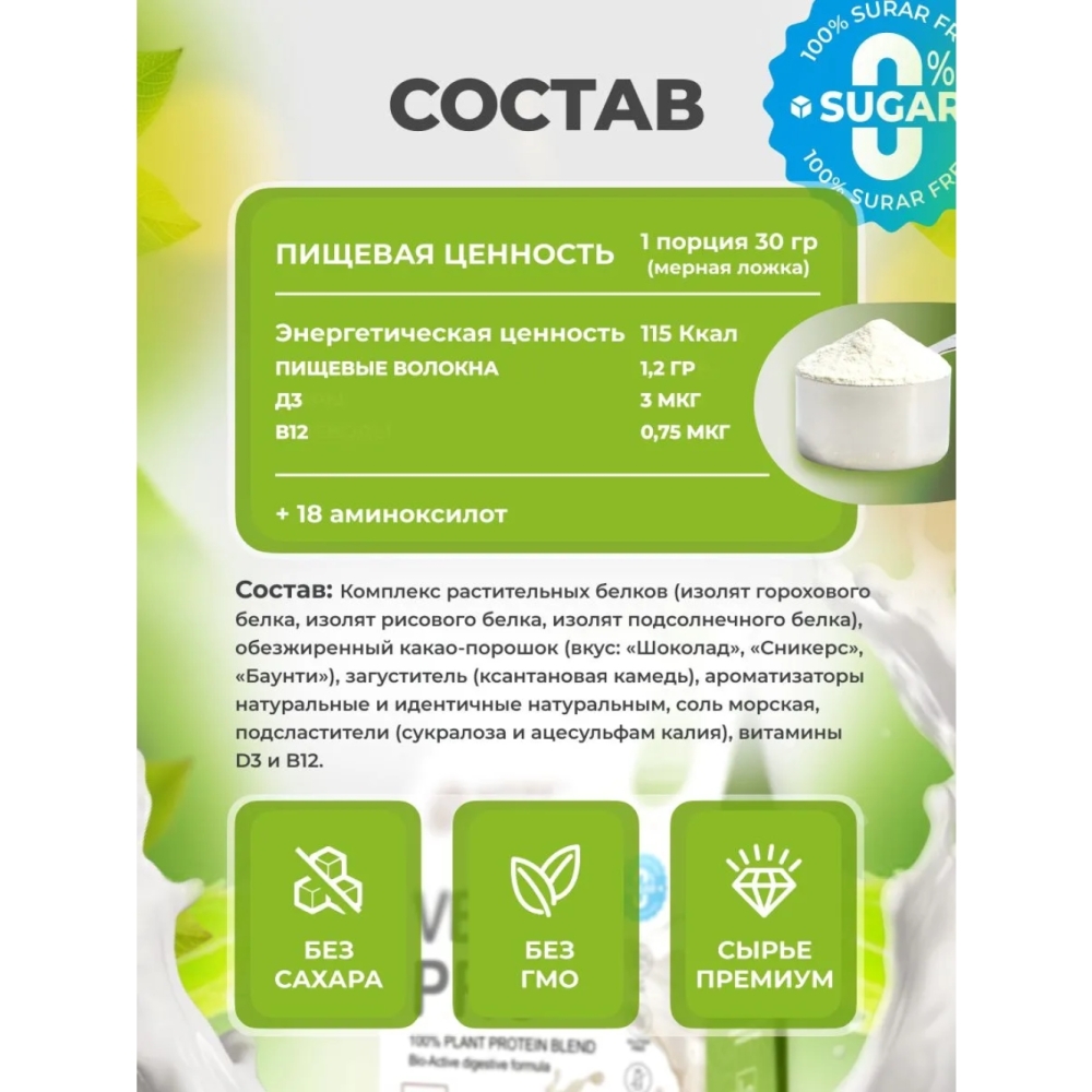 Мощь трех растительных белков: Уникальная комбинация горохового, рисового и подсолнечного изолятов обеспечивает полный аминокислотный профиль и максимальную биодоступность!