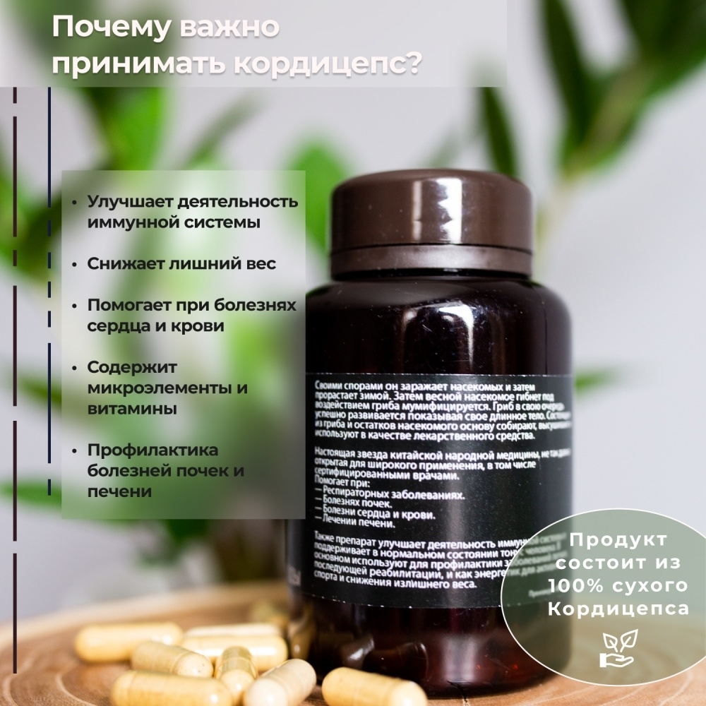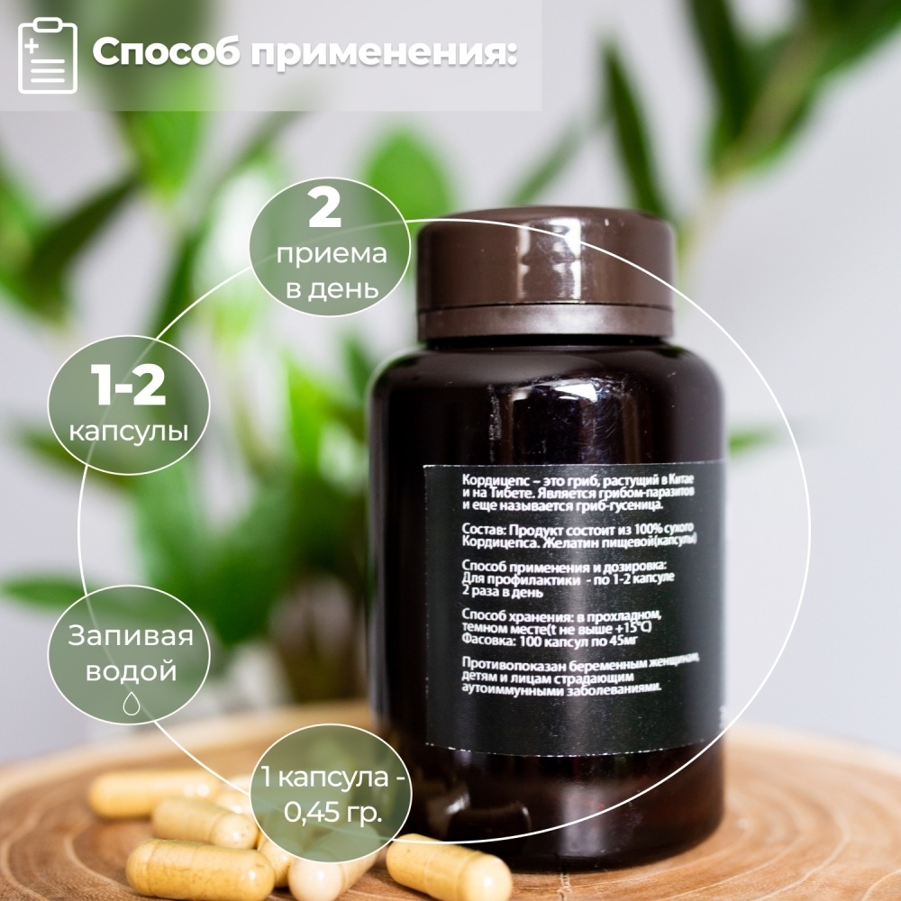 Состав: Продукт состоит из 100% сухого Кордицепса и пищевого желатина (в капсулах).