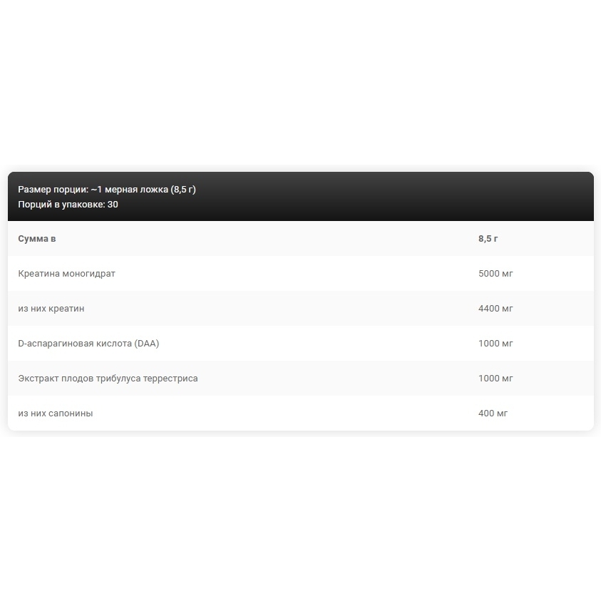 Состав: креатина моногидрат, D-аспарагиновая кислота (DAA), экстракт плодов Tribulus terrestris ( Tribulus terrestris L.; стандартизирован до 40% сапонинов), ароматизаторы 1,2,3,4,5,6,7,8,9 , ароматизаторы. 10 , регулятор кислотности (лимонная кислота), концентрат сока красной свеклы 2,3,5,6,7,8,9,10 , соль, концентрат черной моркови 3,9,10 , антислеживатель (Е551), подсластители ( сукралоза, ацесульфам К), краситель (Е160а) 1,2,4,5,8 .